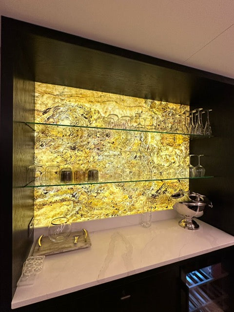 Slate veneer translucent sheets are made with a transparent resin backing for use with back lighting.